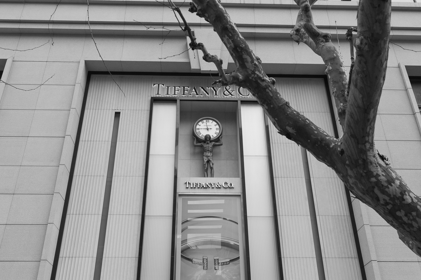 It was really strange I was walking back from The Bund in Shanghai and I just looked up and saw this big clock outside Tiffany and Co and under the big clock was a statue of a man holding the clock on his shoulders. I suddenly found myself thinking and photographing the clock first I was close then I started walking backwards from the image so it became smaller. I had just a 35mm prime lens on the camera and my legs were my zoom.